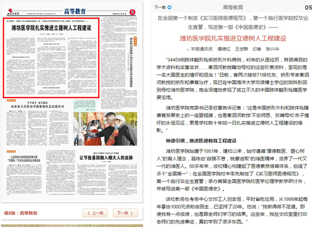 11月12日,《山东教育报》在《高等教育》版头条刊发文章《潍坊医学院扎实推进立德树人工程建设》(作者:谭德红 王世群 张兴华)。文章报道了我校始终遵循“厚德载医、塑心树人”的育人理念,弘扬“自强不息,锐意进取”的潍医精神,加强师德引领,构建全方位育人格局,锻造德育教育品牌特色,不断推进立德树人工程建设,培养了一代又一代的优秀潍医人。
