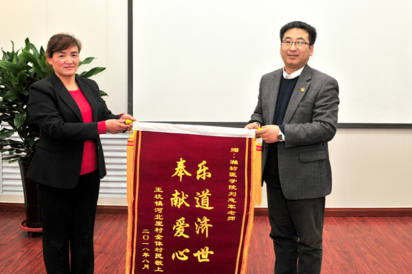 11月15日下午,青州市王坟镇河北崖村村主任焦正霞、村委委员董秀录专程来到学校感谢我校临床医学院副教授刘志军博士,并赠送“乐道济世,奉献爱心”锦旗。党委组织部部长张建华、临床医学院党委书记董铁军等与焦正霞一行进行了座谈。