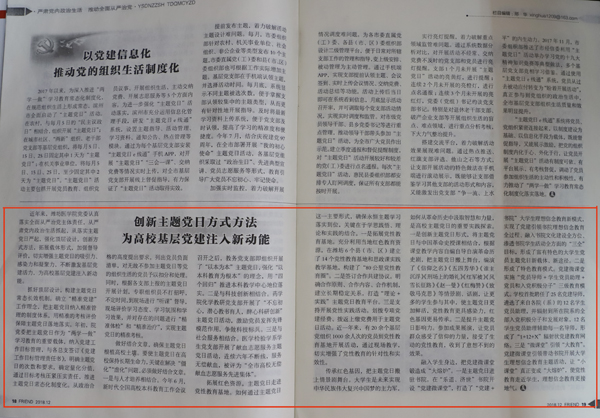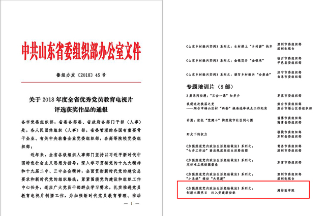 近日,省委组织部办公室下发《关于2018年度全省优秀党员教育电视片评选获奖作品的通报》,我校报送的《创新主题党日 注入党建新动能》专题片荣获三等奖,全省高校仅我校与山东大学获此殊荣。此外,由省委组织部主办的《党员干部之友》(2018年第12期)以“创新主题党日方式方法 为高校基层党建注入新动能”为题报道我校开展主题党日特色做法,这集中体现了我校全面推进基层党建创新工程、提升基层党组织组织力的重要成果。