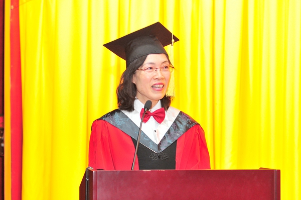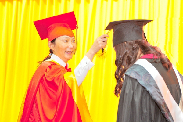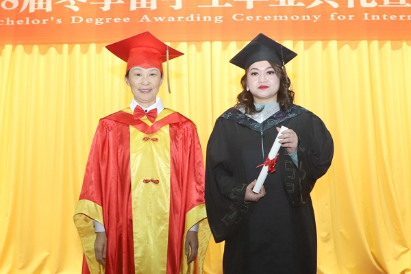 校学位评定委员会主席、校长管英俊为获得学士学位的留学生一一扶正流苏,颁发学士学位证书。