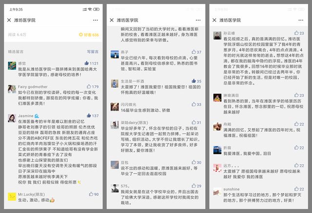 3月8日,我校官方微信发布“【潍医快闪||《我和我的祖国》】去奔跑、去奋进、去追梦!”活动视频报道,短时间内就刷爆“朋友圈”,得到社会各界广泛赞誉,尤其在师生和广大校友中引发热烈反响。师生和校友纷纷留言表达对潍医的热爱,对祖国的祝福。截止到目前,活动视频报道阅读量达6.6万人次,收到留言评论300余条。
