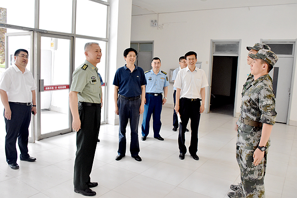 走访校园时,朱军介绍了校园建筑布局与校园文化。随后,丁峰一行来到2019年学校征兵宣传启动仪式的现场,擎着礼宾枪的国旗护卫队队员迎面走来,军姿标准、军容齐整,展示了我校国旗护卫队队员的昂扬风貌。走进潍医大讲堂征兵宣传主会场,退役复学学生代表许传宏、李博文向丁峰一行作了复学后的相关工作汇报,征兵工作站同志汇报了征兵宣传动员和兵役登记工作的相关情况。丁峰对学校2019年征兵、兵役登记等工作给予了肯定并对工作进展进行了现场指导。
