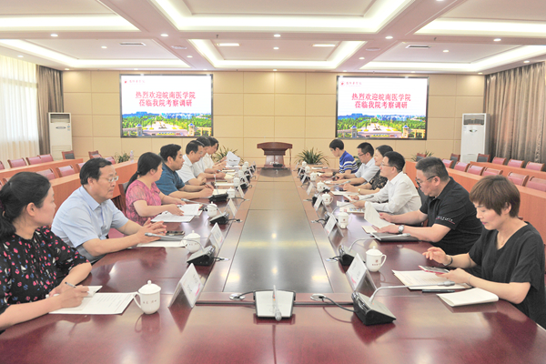管英俊代表学校对郑兰荣一行的来访表示欢迎,并介绍了学校的建设发展情况。双方就教育教学、人才培养、教学医院管理、临床专业认证等内容进行了深入交流,希望借此机会两校能够加强交流,互促共进。会后,进行了对口交流和实地参观。