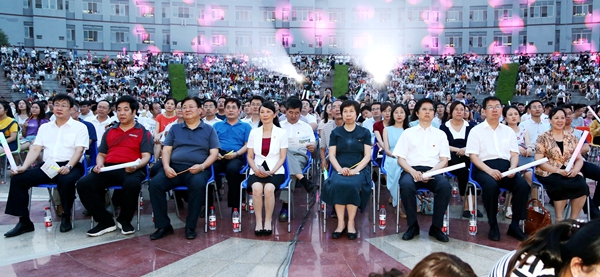 情系潍医,诉说临别前对母校无尽的祝福;相约未来,展望潍医学子辉煌的明天。7月2日晚,由校团委主办的“青春潍医 一路同行”2019届毕业生晚会在浮烟山校区中和广场精彩上演。校领导管英俊、张潍华、孙宏伟、朱军、井西学、葛国文、刘军、田艳玲,部门、院(系)负责人,团总支书记、学生辅导员及2019届全体毕业生3700多人,共同度过了这个充满着温情和感动、承载着欢笑与泪水的美好夜晚。