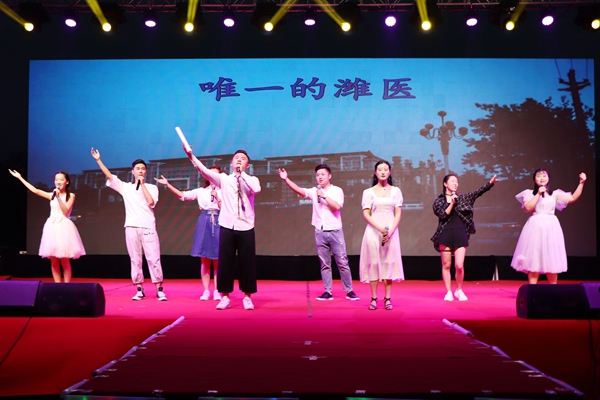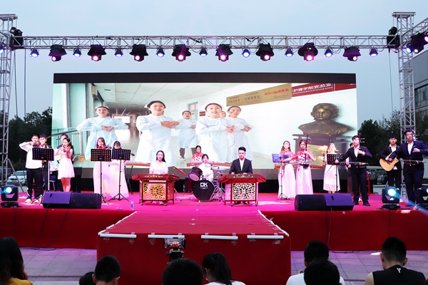 晚会在精彩的开场器乐表演《初见》中拉开了帷幕,伴随着上半年刚参加完CCTV3《向幸福出发》栏目录制的留学生乐队的《老男孩》《我爱你中国》,离别学子作别青春、难舍情深的心声娓娓道来。《南山南(潍医版)》《明天你好》《飘向远方》《匆匆那年》《天籁之爱》,一首首抒情优美的歌曲,唱响了毕业生的不舍与眷恋。临床医学院辅导员与毕业生深情献唱《后来》,演绎着老师对学生的依依不舍。一曲《父亲写的散文诗》,则传递着毕业生对母校和师长的崇敬和深深眷恋。毕业生们精心编排的舞蹈《最好的我们》《共婵娟》《月影》《我们的梦,永远不会落幕》《再遇见》,动感的节奏舞动出毕业生们对母校的恋恋不舍,每一次跳跃,每一次伸展都展现出毕业生对未来的憧憬。民乐《国乐巡音》、西洋乐《青春不散》抒发了毕业生对祖国的热爱之情和对青春年华的感悟。真挚唯美的《缘聚潍医》诗朗诵、《我们的故事》舞台剧带领同学们回望潍医的点点滴滴,畅想未来的希望和梦想,一幕幕校园图景感染着在场的每一位师生。晚会在大合唱《友谊地久天长》《启程》中推向了高潮,全场毕业生挥动起手中的荧光棒营造出绚丽的海洋,青春的歌声久久回荡。