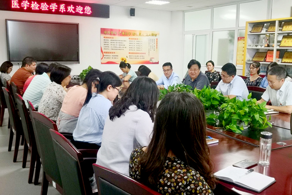 孙宏伟以《不忘初心、牢记使命,为提升教风学风注入党建新动能》为题,结合立德树人和提升教育教学质量,就党建工作如何与提升教风学风相结合向师生阐述了如何“不忘初心、牢记使命”。他从党建工作与院系工作要统筹谋划、教学相长、从严治学三方面分析了教育教学效果对提升教风学风的重要意义。他指出,党员要深刻学习和领会习近平总书记初心使命讲话的内涵和要求,教师要时刻牢记走上讲台时所担负的责任和担当,学生要时刻记牢踏入大学校门那刻的决心和使命,只有教学相长,从严治学,才能真正提升人才培养质量。他还结合医学检验学系实际情况,就教育教学状况、人才梯队建设、科技创新成果培育提出了指导意见。