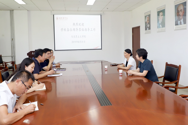 管英俊一行深入到各教研室,与教师们进行亲切交流,询问他们的学习和工作情况,并认真听取了马克思主义学院负责人关于新学期教学运行状况、学院工作计划以及省级示范马克思主义学院建设情况汇报。