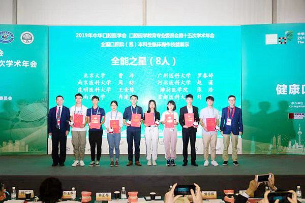 8月28日,由中华口腔医学会口腔医学教育专业委员会承办的“2019年全国口腔院(系)本科生临床操作技能展示”在上海拉开帷幕。本次大赛共吸引了全国56所本科院校同台竞技,大赛包括牙体、外科、修复三项技能操作,每项的操作时间均为20分钟,口腔医学教育专委会组织专家评委对操作技能展示现场及模型进行评选,由专家评委和机器扫描共同进行评定。经过激烈角逐,我校口腔医学专业张浩同学脱颖而出,以全国第七名的成绩荣获“全能之星”称号,实现了学校在全国口腔医学技能大赛新的突破。口腔医学院院长胡温庭及指导老师带领学生参加了本次大赛。