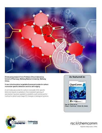 团队周进博士设计的线粒体靶向分子探针,成功用于外源性和内源性CO的检测和成像,在相关生物学研究方面具有广阔的应用前景,对于深入了解其作用机制具有重要意义。该项成果“A new mitochondrion targetable fluorescent probe for carbon monoxide-specific detection and live cell imaging”发表在Chemical Communications 2019,55, 9444-9447(影响因子6.14),并被遴选为背封面文章highlight。Chemical Communications是自然指数收录期刊,中科院一区期刊,被公认为国际化学领域顶尖杂志之一。