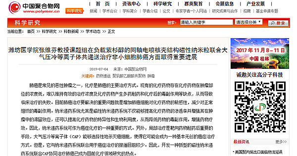 团队利用同轴电喷雾的方法构建了负载紫杉醇的同轴电喷核壳结构磁性纳米粒(PTX-NPs),考察其联合大气压冷等离子体(CAP)共递送对非小细胞肺癌(NSCLC)的治疗效果及协同作用的分子机制,为肺癌治疗提供新策略,对肿瘤治疗具有重要意义。相关研究成果发表在ACS Applied Materials & Interfaces 2018, 10, 43462−43471(影响因子8.09)。该项研究成果被中国聚合物网、高分子科技微信公众号等媒体报告。