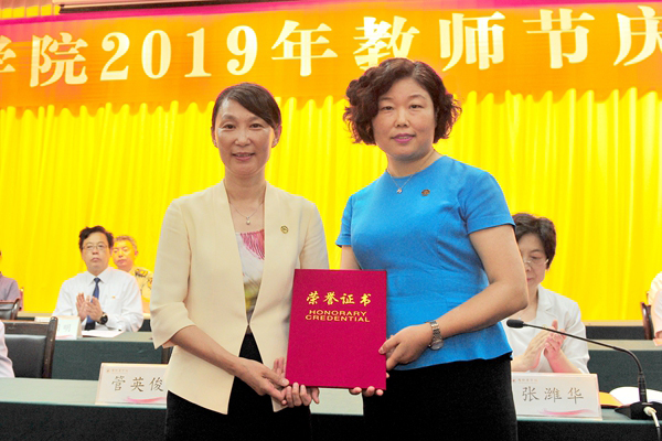 管英俊分别为“全国优秀教师”张维芬教授、国务院政府特殊津贴获得者高志芹教授、全国“白求恩式好医生”任春娥教授及山东省有突出贡献的中青年专家尹文强教授颁发了荣誉证书。