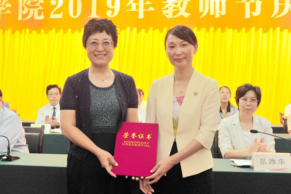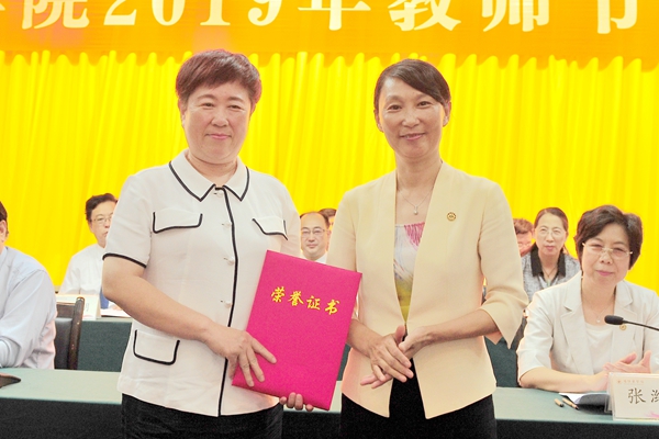 | 向获得“潍坊医学院先进工作者”荣誉称号的教师代表颁发证书 |
