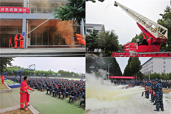 本次演练采取“全程解说、全程模拟、全程演示、全程参与、全程实战”的情景教学方式,内容分应急疏散演练、火灾扑救演练、高空救援演练、灭火实战演练4个阶段12个环节按专题进行。以《潍坊医学院突发公共事件应急预案》为依托,模拟校园110指挥中心在接到火灾报警后,立即组织学校消防员赶赴火灾现场灭火和人员应急疏散,同时拨打119报警、向上级领导报告、安排专人到校门口迎接消防车,并快速启动应急预案。潍城区消防救援大队指战员在接到报警后立即出警,40米云梯消防车向演练区域驶来,指战员们充分运用综合战斗消防车上的伸缩式高空云梯、自动升降平台及高空灭火水炮,通过“人令配合、人人配合、人车配合”,以高效紧张有序的节奏演绎了一场精彩的火灾扑救、高空救援、应急疏散、逃生自救演练。经过消防救援大队指战员和学校消防员的协同配合压制了正在蔓延的火势,扑灭火灾、救出被困人员。接着转入灭火实战环节,在解说员讲解下,学校消防员们向新生现场演示了灭火器使用方法,并组织新生各班级学生代表,按照灭火的规范步骤和方法,进行了灭火器灭火演练,在灭火实战中体验学习消防安全知识和技能。