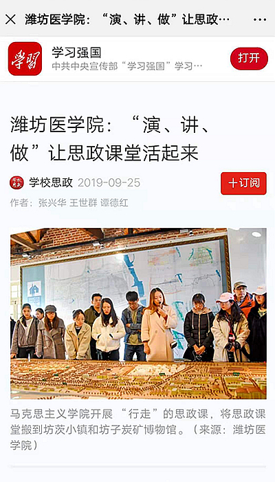 9月25日,中共中央宣传部“学习强国”学习平台以《“演、讲、做”:让课堂活起来——潍坊医学院思政课实践教学改革“三部曲”纪实》(通讯员:王世群、谭德红)为题,报道了我校思政课实践教学改革的特色、亮点与经验。