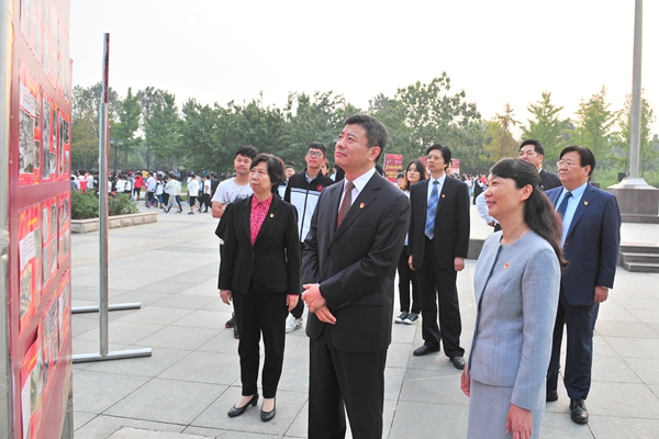 升国旗广场会结束后,师生现场观看了《庆祝新中国成立70年——奋斗的历程》图片展。