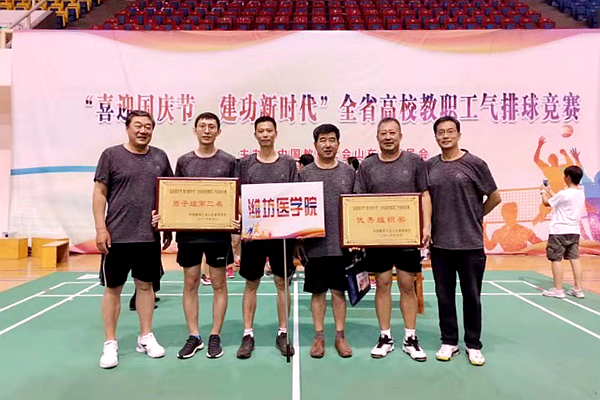 9月28-29日,“喜迎国庆节,建功新时代”全省高校教职工气排球比赛在山东财经大学举行。我校由工会主席李志华领队,队员朱红伟、刘汉波、平永忠、岳军弟、孙海勃、齐雷涛、张劲等参加了比赛。队员们在比赛中发扬“自强不息,锐意进取”的潍医精神,敢打敢拼,团结协作,经过激烈角逐,最终获得男子组第三名的好成绩。我校荣获本届比赛优秀组织奖。