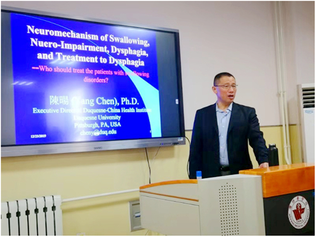 在康复医学院会议室,陈旸以《Neuromechanism of Swallowing Neuro-impairment,Dysphagia,and Treatment to Dysphagia》为题作学术报告,他结合自己多年临床与教学经验,分析了言语治疗在中国及世界的发展现状和趋势,剖析了吞咽的神经机理,指出了吞咽对于临床疾病的重要意义,对中风、脑外伤、脑部肿瘤术后吞咽障碍的病人的评估、诊断与治疗提出了详细而中肯的意见,并与在场的师生进行了互动答疑。陈旸教授还向2017级康复治疗学专业学生宣讲了中美硕士合作交流项目,为同学们的学业生涯提供了新的方向和思路。