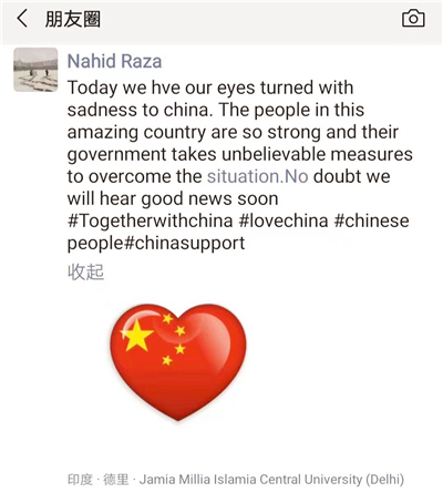 1月30日晚上近9点,学院留学生工作办公室的刘老师收到一条微信,是去年已毕业的印度学生Mohammedqais Abdulkadar Kothiwala发来的:“老师,我想回中国帮忙抗击疫情。”刘老师为了学生的安全婉拒之后,他无奈但仍坚定地表示:如果疫情形势变得更严峻了的话,请老师帮忙协调,我要回到中国医院去做防控工作,尽一臂之力!刘老师对记者说:“留学生在校学习至少六年,跟学校结下了深厚的情意,我完全感受得到他们这种急迫的感恩回报之情。”
