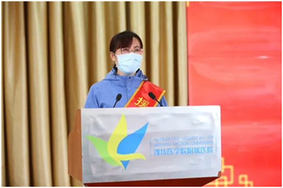 附属医院儿科副护士长李春莲代表本次返潍医疗队队员发言。她首先向学校、医院领导及同事们无微不至的关怀、关爱表示感谢!表示一定会全面总结援助工作经验,为高水平医科大学创建和附属医院建设贡献力量。