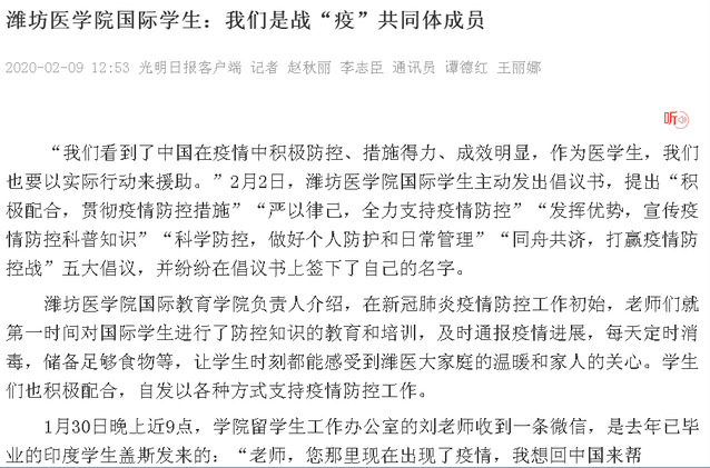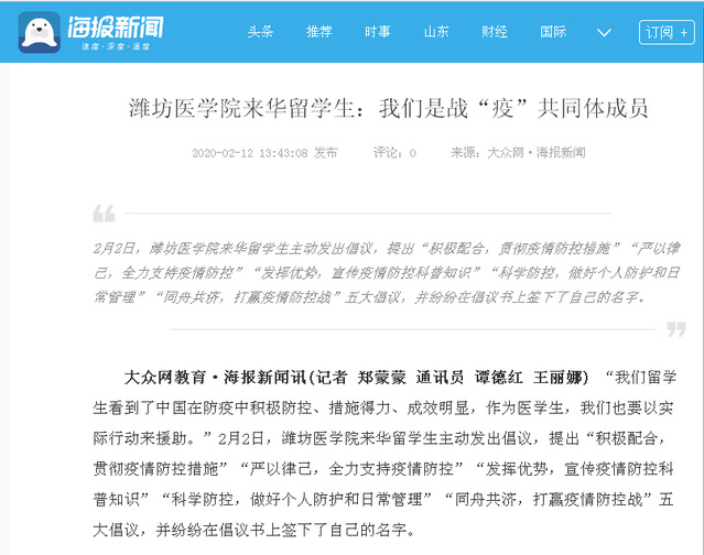 文章指出,在这次抗击新冠肺炎的战斗中,潍医的留学生团结一心,服从学校管理,以自己的实际行动共同为战“疫”贡献力量。他们自觉按照科学指引做好个人防护,保持身心健康;利用所学知识,通过微信和网络等渠道,开展预防新冠肺炎健康科普宣传;以各类社交软件为载体向本国人民传递真实准确的最新疫情消息,不造谣、不信谣、不传谣,树立了留学生在支持和参与本次疫情抗击中的良好形象,诠释了战“疫”共同体的深刻内涵。