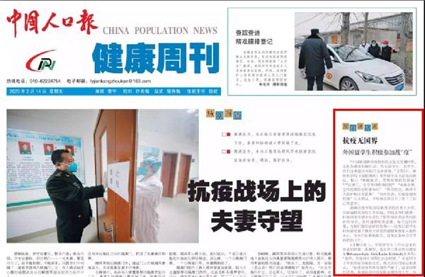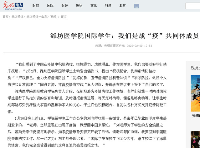 近日,《光明日报》客户端、《中国人口报》、光明网、大众网等媒体分别以《潍坊医学院国际学生:我们是战“疫”共同体成员》《抗疫无国界 外国留学生积极参加战“疫”》等(作者 谭德红 王丽娜)为题,报道我校来华留学生以实际行动为战“疫”贡献力量的暖心故事。