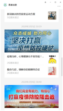 重力度:宣传到位,强化教育。隔离病毒,但不隔离爱。学院通过QQ群、微信群、“青春如歌”公众号、“导到家”微视频等多种平台,积极宣传居家隔离防控措施,歌颂正面典型,弘扬正气,激励斗志,鼓舞士气。充分做好同学们的心理疏导工作,引导同学们理性应对疫情,做好心理的自我调适,在疫情下保持积极健康的心态,不信谣、不传谣。为加强爱国主义教育,学院举办了“携手战疫,青春有我”征文活动、“众志成城,万众抗疫”打卡活动、“疫情防控,众志成城,共克时艰”主题团日活动等,以此汇聚能量和爱,将最真诚的祝愿送给奋斗在战“疫”路上的每一个人。