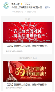 有温度:志愿服务,传递温暖。为增强青年学生的责任感和使命感,学院呼吁广大同学在做好自身防护的同时,积极参加当地的志愿服务活动,为打赢疫情防控阻击战贡献自己的力量。康复学子响应号召,秉承“乐道济世”的校训,弘扬“自强不息、锐意进取”的潍医精神,勇挑重担、义无反顾地参与到这场没有硝烟的战“疫”中,在各个基层工作岗位上,为共筑抗疫防线贡献力量。截至目前学院有10余名青年志愿者参与到各地的疫情防控工作中,学院公众号专门开设了“青春助力战疫情,康复学子在行动”专栏,宣传他们的先进事迹。