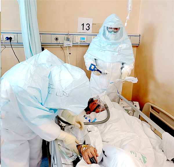 校友柳国强和唐润栋来自青岛大学附属医院。柳国强表示,“我们现在所有在一线的战友,都在与时间赛跑,只想抓紧时间多救助一个患者。”据他介绍,小分队的工作状态是这样的,因为感染性极大,做气管插管时要最高级别的三级防护,即头部保护3关,护目镜、防护面屏、防护罩;口罩两层,最内层为N95,外层为外科口罩(最外层可以再加一层外科口罩);衣服三层,内层一次性隔离衣、中间防护服、再加一层一次性隔离衣;手套三层,内两层为乳胶手套,外层为乳胶手套或检查手套;鞋套3层:内层鞋套,中间靴套,最外鞋套;反复手消毒。柳国强笑言自己工作时就像个五花大绑的粽子,又笨又重行动迟缓。