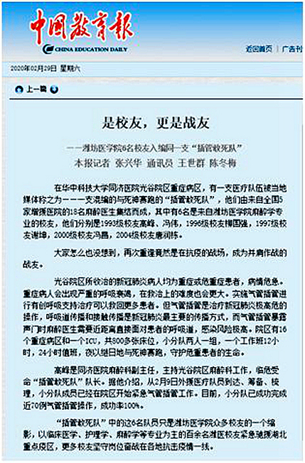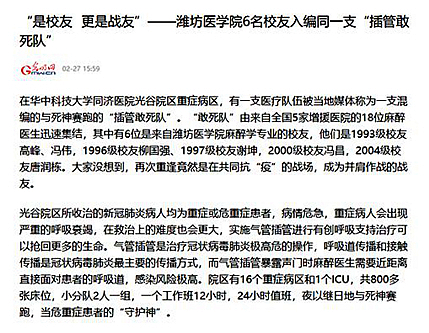 文章报道,在华中科技大学同济医院光谷院区重症病区,有一支医疗队伍被当地媒体称之为一支混编的与死神赛跑的“插管敢死队”。“敢死队”由来自全国5家增援医院的18位麻醉医生迅速集结,其中有6位是来自潍坊医学院麻醉学专业的校友,他们是1993级校友高峰、冯伟,1996级校友柳国强、1997级校友谢坤,2000级校友冯昌,2004级校友唐润栋。再次重逢他们成为并肩作战的战友。