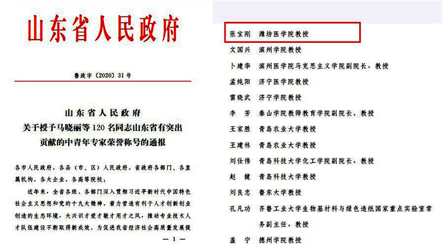 2月26日,山东省人民政府下发《关于授予马晓丽等120名同志山东省有突出贡献的中青年专家荣誉称号的通报》(鲁政字〔2020〕31号),公布了120名有突出贡献的中青年专家荣誉称号名单,我校临床医学院张宝刚教授入选。