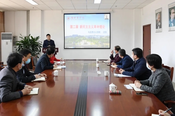 校领导现场听取了中国化马克思主义教研室沈浩老师为2018级部分专业学生的授课,课下对授课进行了点评,并与马克思主义学院教师进行座谈。李明充分肯定了沈浩老师的授课,认为授课思路清晰、史料丰富、教学设计好、注重师生互动,是一堂精彩的思政课。