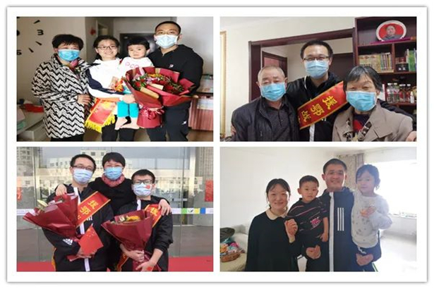 管英俊在有关人员陪同下专程到援鄂医疗队员季宏志家中看望。各位援鄂英雄在所在科室主任、护士长陪同下乘车回家与家人团聚。