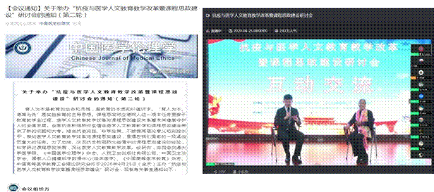 4月25日,由《中国医学伦理学》杂志倡议发起,由西安交通大学医学部、《中国医学伦理学》杂志、人民卫生出版社有限公司、中国卫生法学会、国家人口健康科学数据中心(临床医学)、《中国高等医学教育》杂志、中国高等医学教育工会理论研究会共同主办,陕西中医药大学、郑州大学医学院、深圳大学医学部共同承办,潍坊医学院等全国180余所单位协办的“抗疫与医学人文教育教学改革暨课程思政建设”(网络)研讨会,通过网络直播平台+录播形式成功召开。教师、医护人员、管理工作者、学生、媒体朋友、关心医学人文教育教学改革及医学生成长的各界人士等注册与会,累计观看人数达10余万人次。