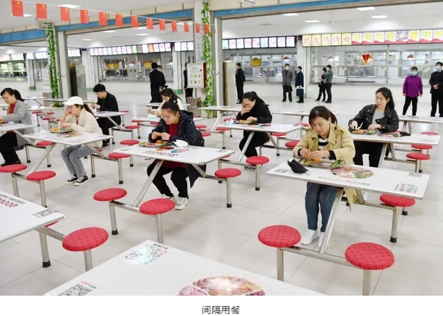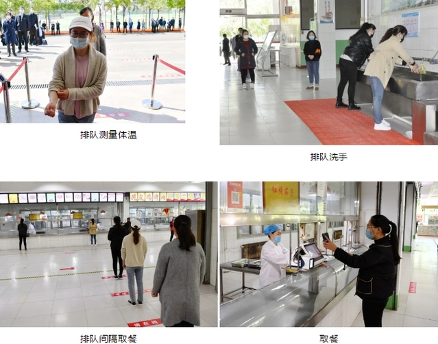 演练环节:依次开展入口排队、检测体温、足底消毒、洗手、排队、窗口取餐、餐桌就座、餐后餐具放置应急处置。