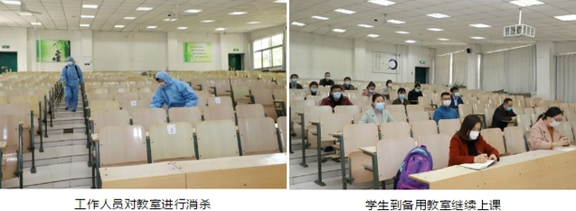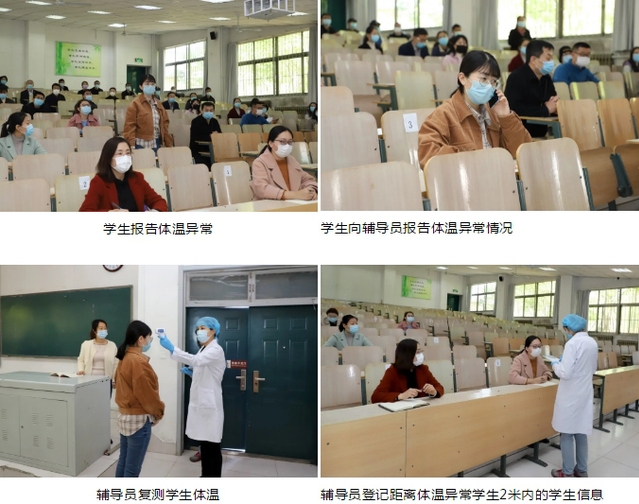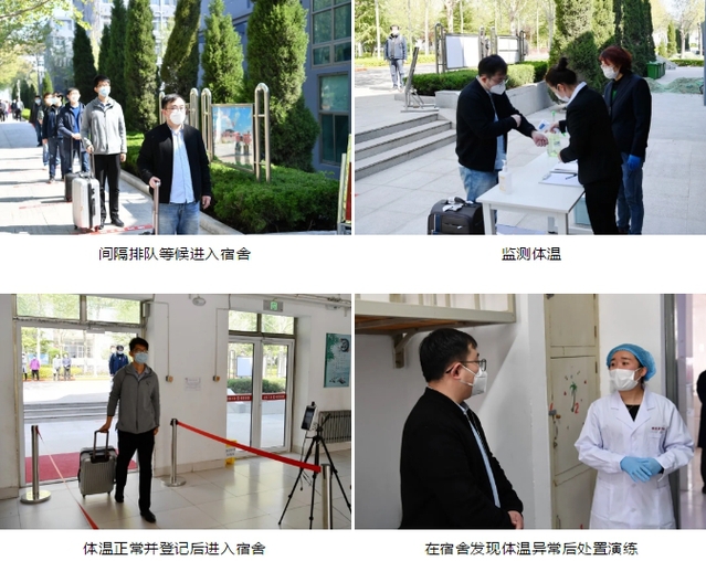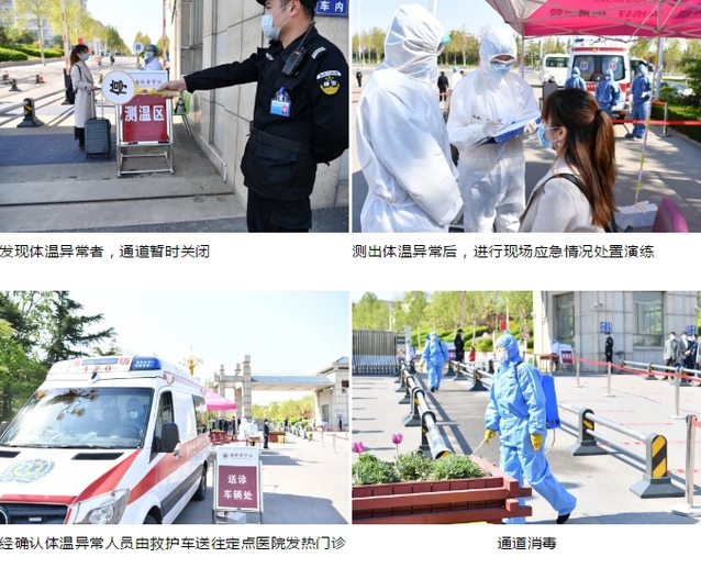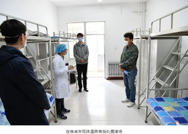 本次应急演练共分四个场景,分别是开学时学生返校及特殊情况应急演练;学生公寓出现发热学生演练;教室出现发热人员演练;就餐安排演练。