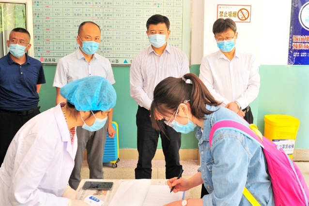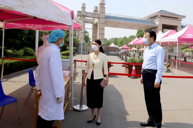 校领导一行在校门口处,现场查看了学生返校测体温、行李消毒、身份核验、核酸检测采样等各个环节,听取了相关部门负责人的情况介绍,并与现场工作人员进行了交流,详细询问工作情况。