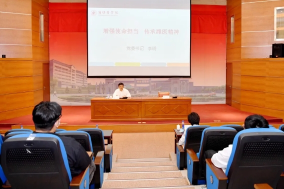 李明以《增强使命担当 传承潍医精神》为题,从“新冠肺炎疫情总体态势”“中国‘抗疫精神’的丰富内涵”“新冠疫情面前潍医人的责任和担当”“增强使命担当、传承潍医精神”四个方面,与临床医学院、公共卫生学院师生分析中国抗疫彰显的中国共产党领导和中国特色社会主义制度的显著优势,讲述抗疫一线的感人故事,以及潍医人在国家和人民危难时特有的责任和担当,向潍医学子提出要“坚持真理、崇尚科学;心怀家国、服务人民;不畏艰难、奋发有为”的希望。