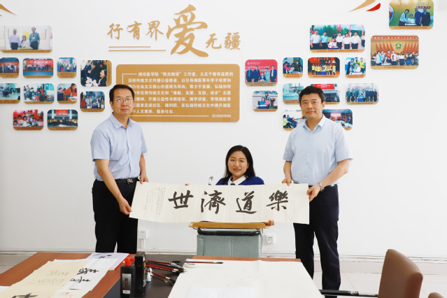 在互动交流中,李明指出,晓清老师是一位真正坚强的新时代青春榜样,她的励志事迹也正是潍医“自强不息、锐意进取”精神的写照。他鼓励在座同学们要以晓清老师为榜样,目标坚定、意志坚强,在人生的熔炉中不断淬炼自我、提升自我。他希望晓清老师常来到潍医,在大学生中多讲讲她的励志故事和书法技艺,进一步提升潍医学子的人文素养。现场刘晓清挥毫书写了潍医校训“乐道济世”。