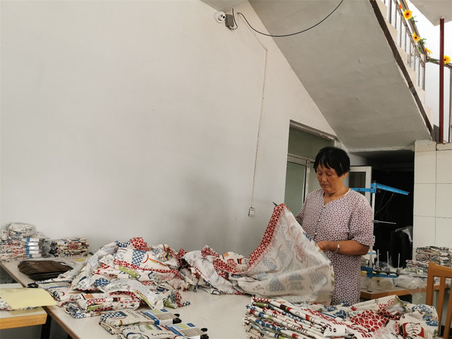 70岁的路奶奶是建档立卡贫困户,她来到了好姐妹家纺经营部,负责整理布匹、剪剪线头,劳动强度不大,一个月也能赚个零花钱。