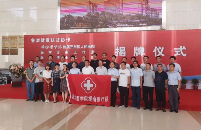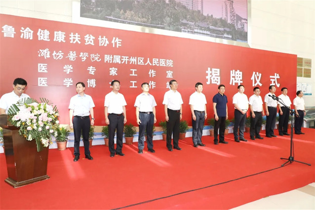 李明和谭晓均共同为“潍坊医学院附属开州区人民医院”揭牌。田庆盈和蒋牧宸为“鲁渝扶贫协作医学专家工作室、医学博士工作站”揭牌。揭牌仪式上,葛国文代表学校致辞。李晓海、亓传敬分别介绍了东西扶贫协作健康扶贫工作开展情况。