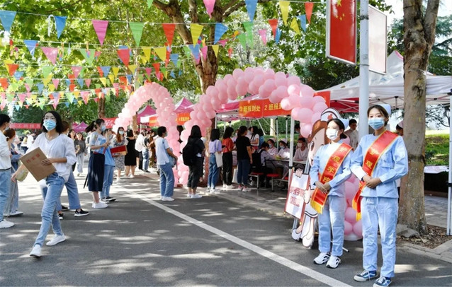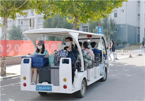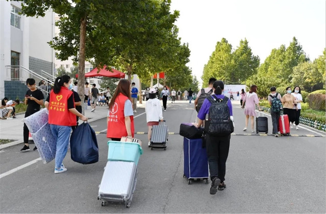 学校充分利用网络信息技术和数字迎新系统,将入学教育、疫情防控数据收集、宿舍服务等业务前置,实现了智慧迎新工作。在杏林路上,LED屏竖立在侧,屏幕上实时更新、展示着新生的报到人数、来自省市的比例、男女生比例等新生大数据。为方便新生报到,学校在火车站、汽车站设立站点,安排班车接新生到校。与往年不同,今年送新生的家长不能入校,学校在校门口设立家长休息区,全校志愿者集结,全程引导提供“一对一”一站式贴心服务,同时安排了各种类型的摆渡车接学生直接入宿舍,并有工作人员帮助搬运行李。学生餐厅全天候保障用餐、“绿色通道”迎新窗口、新生安全教育宣传站、医疗服务站……迎新的每一处细节都承载着无微不至的关怀。