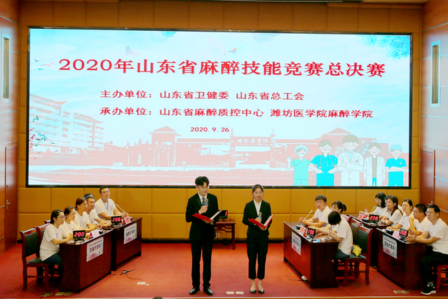 本次比赛由山东省卫健委、山东省总工会主办,山东省麻醉质控中心、潍坊医学院麻醉学院承办,来自山东省的22个代表队66人参加总决赛、省内外的44位专家担任评判专家。决赛分为个人赛和团体赛,包括理论考试、技能操作竞赛和知识竞答。范围涵盖麻醉解剖学、麻醉药理学、麻醉生理学、麻醉设备学、临床麻醉学、危重病医学、疼痛诊疗学、传染病防治法和基本医疗卫生与健康促进法等内容;技能操作竞赛包括气管内插管、单人徒手心肺复苏、蛛网膜下隙与硬膜外联合阻滞、中心静脉穿刺、电除颤和动脉穿刺测压术,操作评分标准参考我校为主编单位的“十三五”规划教材配套教材《麻醉技能学》。