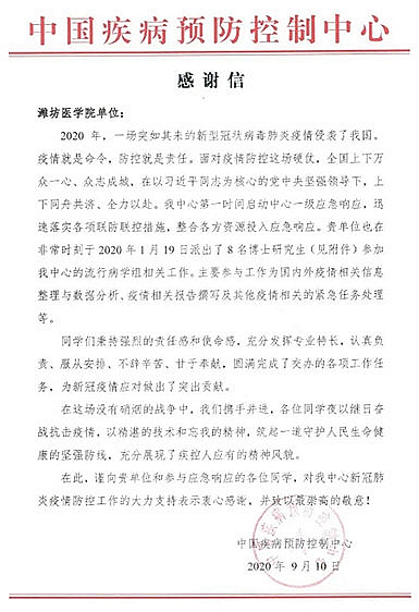 近日,我校收到来自中国疾病预防控制中心的感谢信。信中提到,2020年初,一场突如其来的新型冠状病毒肺炎疫情侵袭了我国。疫情就是命令,防控就是责任。面对疫情防控这场硬仗,全国上下万众一心、众志成城,在以习近平同志为核心的党中央坚强领导下,全国上下同舟共济、全力以赴。