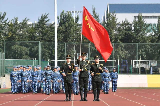 在“迎军旗”的口令声中,军训汇报展演拉开帷幕。分列式展示环节,同学们步调一致、军姿挺拔、正步标准、口号响亮,赢得阵阵喝彩。