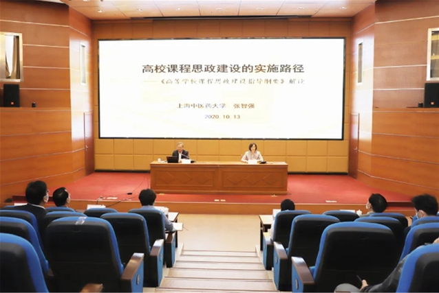 张智强从教育部《指导纲要》的逻辑结构,落实中央“两个所有”要求,发掘各学科门类专业课程中的思想政治教育资源,正确把握思政元素,落实同向同行、构建类型丰富、层次递进的教学体系,课程思政已成为教学管理的组成部分等六个方面对《指导纲要》进行了详细解读,分享了上海中医药大学课程思政建设的成功案例和丰富经验。他指出,思想政治教育要以解决问题为导向,找准教育切入口;要充分挖掘专业知识体系本身所蕴含的思想政治教育元素,实现专业教学与思政课程同向同行;要坚持显性教育和隐形教育相结合的原则,以潜移默化、润物细无声的方法开展课程思政;要坚持实事求是,切忌产生新的“两张皮”,避免“贴标签”等形式主义的做法。课程思政是一项永远在路上的工作,推进课程思政不仅要依靠教师,还要求高校各级领导要服务教师,全心全意为教师教书育人做好各项工作。学校要贯彻落实全国高校思政工作会议精神,主动思考如何在本校实现“所有课程都有育人功能、所有教师都有育人责任”这一目标,并在教学改革方案中体现出来,做出科学安排。