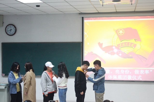 活动中,辅导员为新生团员佩戴团徽,带领团员共同学习《中国共产主义青年团章程》《中国共产主义青年团基层组织“三会两制一课”实施细则》等文件,明确团员义务与责任。新生团员佩戴团徽,重温入团誓词,接受了一次生动而深刻的爱国主义教育和团员意识教育。