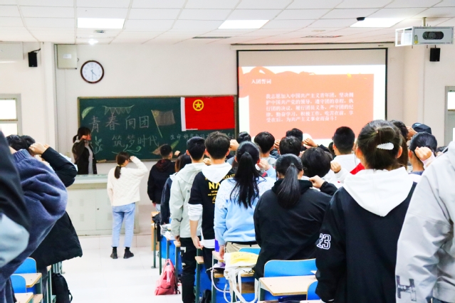在团旗的见证下,辅导员为2020级团员代表佩戴团徽,一起学习了《中国共产主义青年团章程》《中国共产主义青年团团旗、团徽、团歌制作使用管理规定》等文件,随后大家齐唱团歌、重温入团誓词。庄重的仪式使共青团员们再次接受了思想的洗礼,激发他们将入团誓词铭记于心并转化为实际行动,时刻严格要求自己。