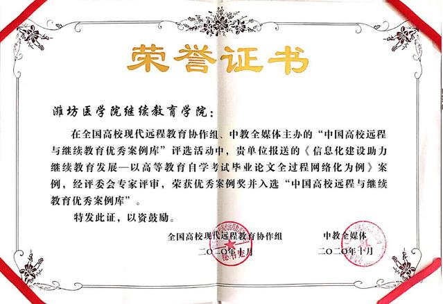 近日,2020中国国际远程与继续教育大会在北京召开。会议举行了“2020中国最具社会影响力高校网络与继续教育学院”“2020中国高校远程与继续教育优秀案例库”与“2020年度中国高校继续教育优秀函授站”颁奖典礼。我校继续教育学院同全国37所院校继续教育学院一起被评为“2020中国最具社会影响力高校网络与继续教育学院”;《信息化建设助力继续教育发展-以高等教育自学考试毕业论文全过程网络化为例》获优秀案例奖并入选中国高校远程与继续教育优秀案例库,3个校外函授站被评为“2020年度中国高校继续教育优秀函授站”。