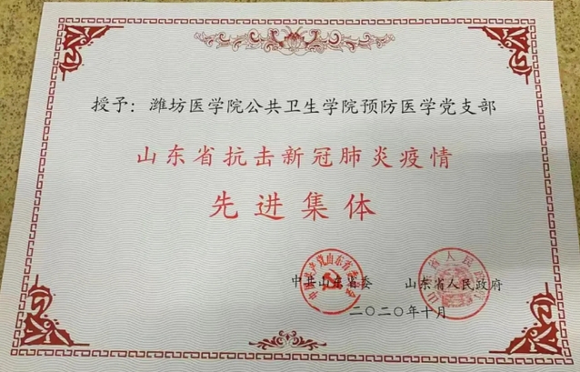会上,我校公共卫生学院预防医学党支部、潍坊市寒亭区人民医院(潍坊医学院第一附属医院寒亭院区)党委被授予“山东省抗击新冠肺炎疫情先进集体”荣誉称号;潍坊医学院附属医院孙广洪等6人被授予“山东省抗击新冠肺炎疫情先进个人”荣誉称号;公共卫生学院预防医学党支部被授予“山东省先进基层党组织”荣誉称号;杨桂茂、褚瑞海被授予“山东省优秀共产党员”荣誉称号。