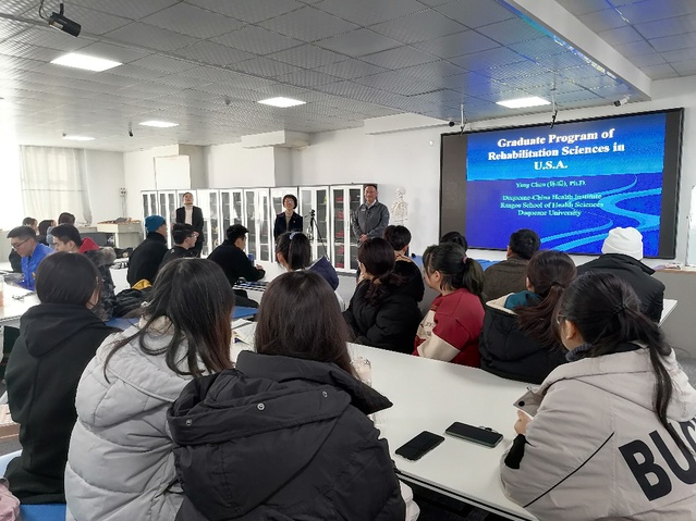 12月8日,美国杜肯大学兰格斯健康学院终身副教授、中国健康研究所所长陈旸博士应邀来我院举行中美康复硕士招生宣讲会,学院院长于丽、部分教师及2018、2019级康复治疗学专业学生120余人参加。宣讲会由学院党总支副书记王雪净主持。